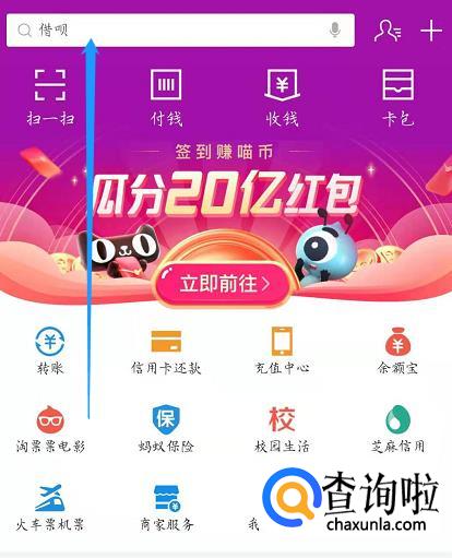 打开支付宝,找到搜索栏: