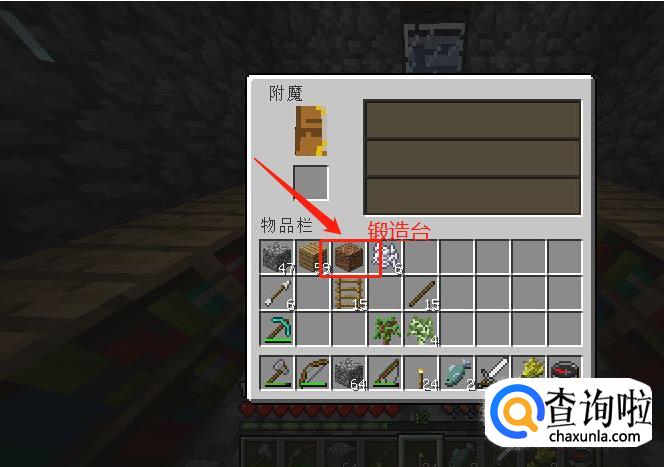 还有另外一种获取方式:下拉找到物品栏,一般创造模式下,都会有锻造台。