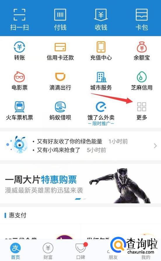 打开支付宝手机客户端,然后单击面板上的”更多“选项卡。