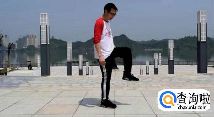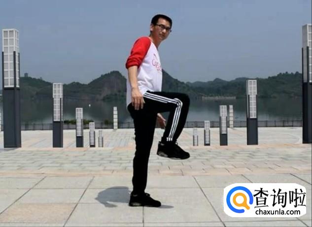 先呈立正姿势,然后抬起左腿,注意左腿的大腿和小腿呈90度角,左腿抬起的同时,右脚向后退一步。
