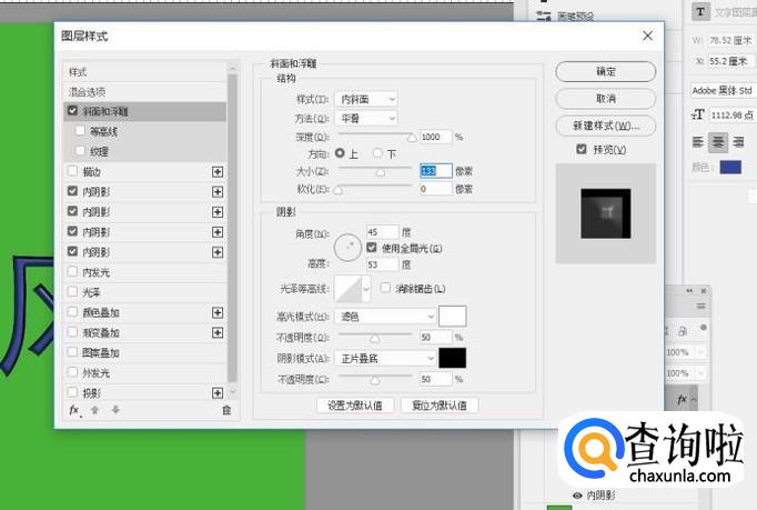在打开的混合模式中,勾选内阴影,斜面和浮雕的参数可以根据需要适当的调整下