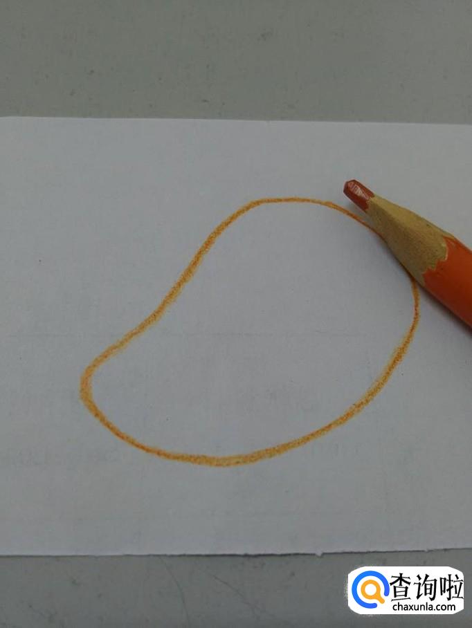 用桔色笔在纸上画一个一头小一头大的形状,这是芒果最大的特点。