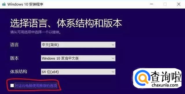 然后去掉“对这台电脑使用推荐的选项”的勾勾,根据另一台电脑的情况选择要安装的版本。