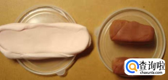 然后,取粉红色的粘土捏成两短的长方形出来,作为小桥的侧边部分,摆放在小盘子上。