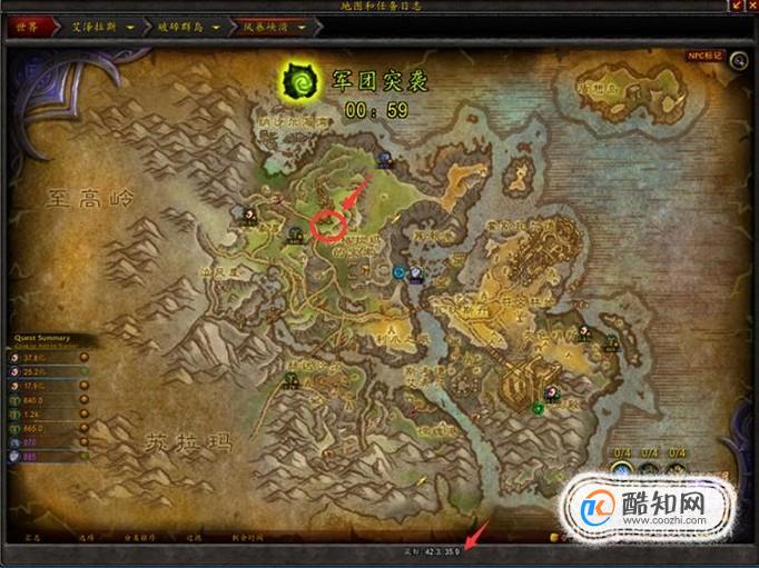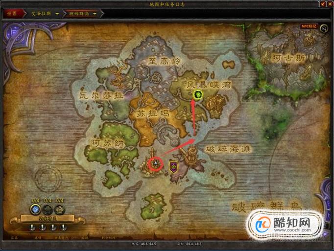 离的最近的鸟点是风暴峡湾的被遗忘者要塞,可以飞去那里,在第二图的红圈左上方处,沿着第一图路线去风暴峡湾,然后任务地点如图红圈所在处以及下方坐标。