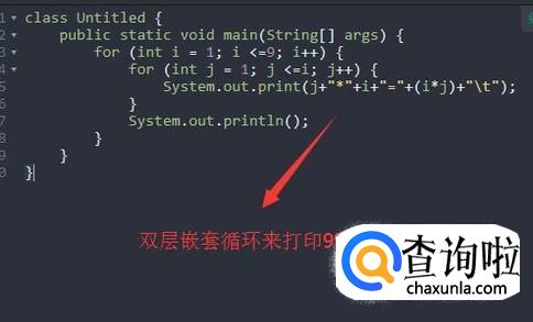 然后我们在main函数中运用两个for循环嵌套进行九九乘法表的输出,如下图所示