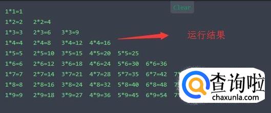 运行程序以后,你会看到如下图所示的正三角形状的九九乘法表,这是我们最常见的样式