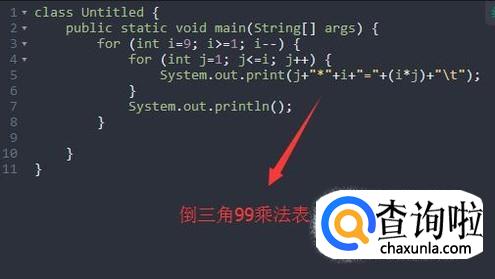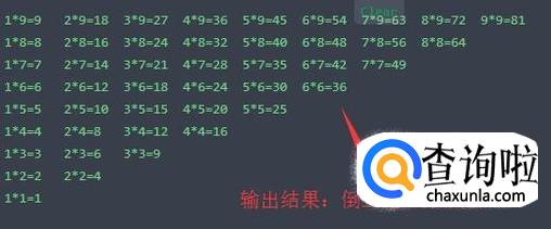 当然,你也可以打印一个倒三角的九九乘法表,如下图所示,还是运用for循环嵌套,只不过这次外层for循环要大