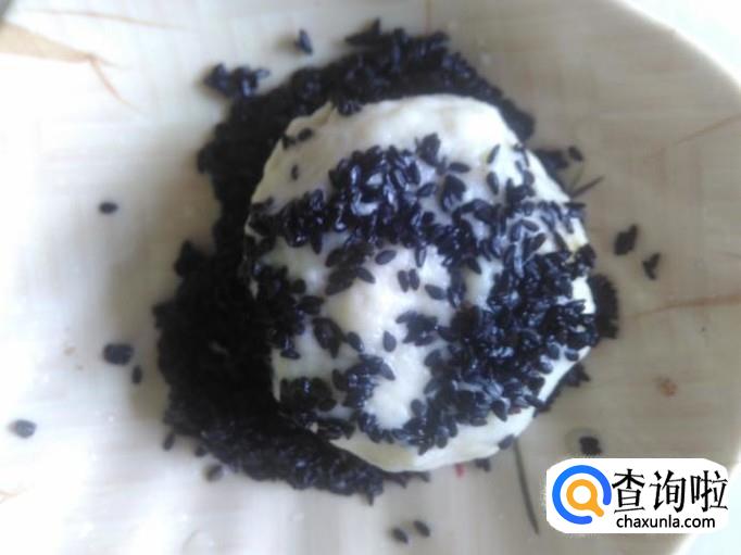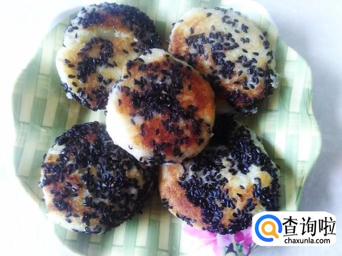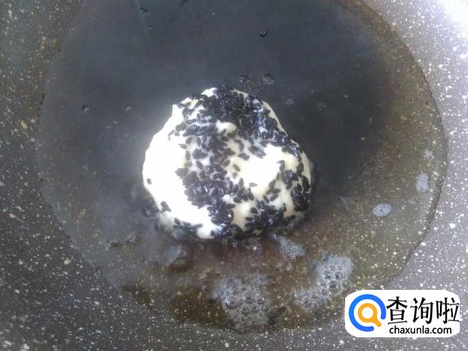 手湿一下水,然后抓适量的粉团揉搓成丸子再压成饼状,放到芝麻里粘满芝麻。