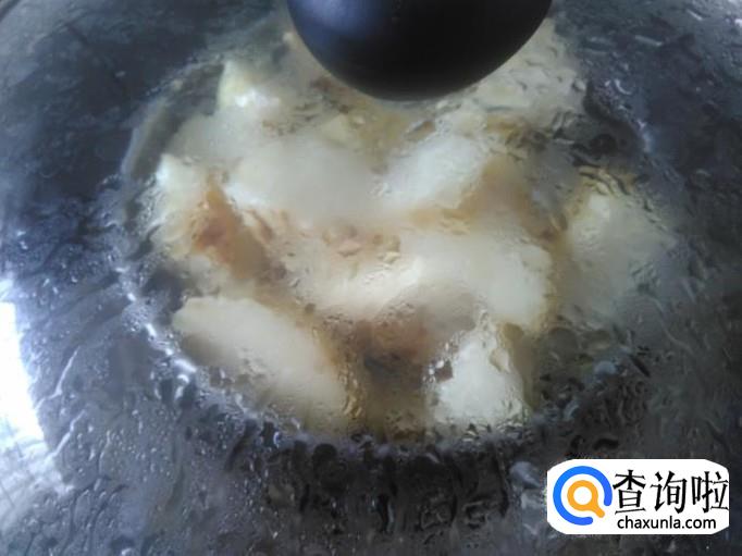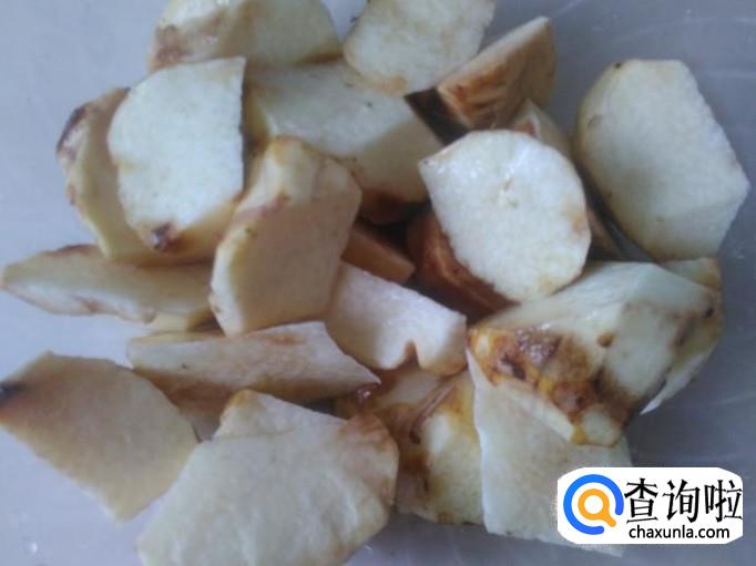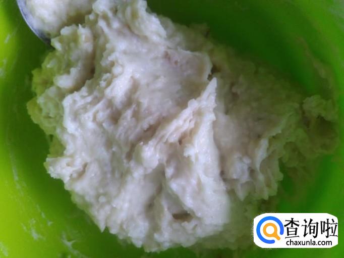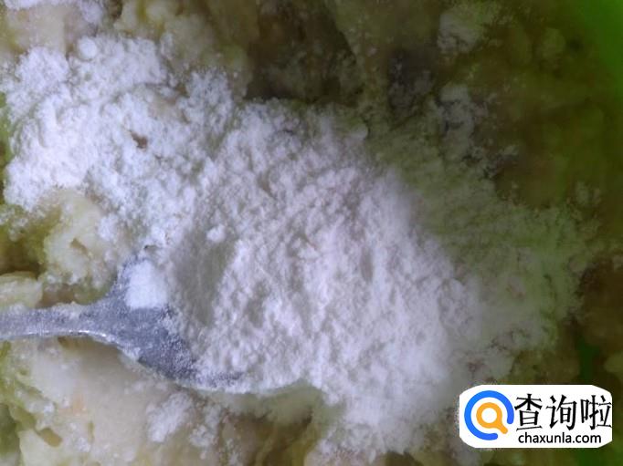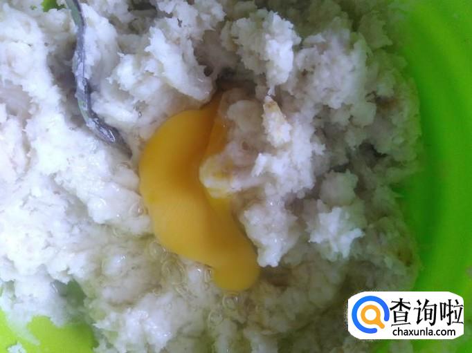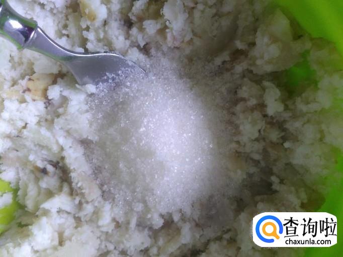 然后拿出来放到盘子里,压成薯泥,再加适量的白糖,打1个鸡蛋进去。