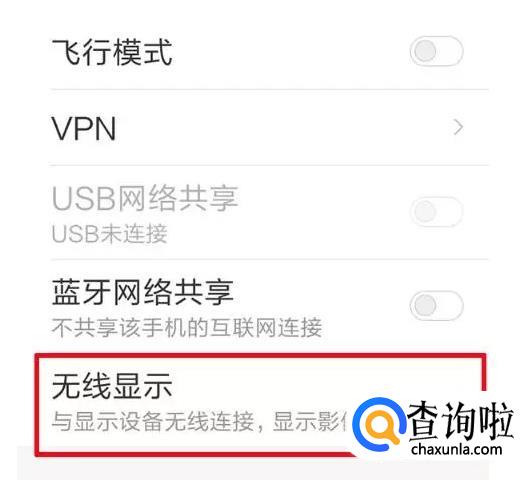 在手机“设置”中找到“无线连接”方式中打开“无线显示”。