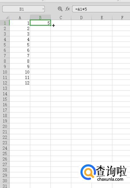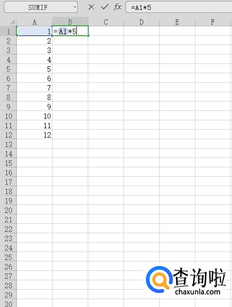 在单元格B1输入公式:=A1*5,如下图所示。