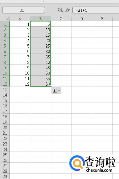 这就我们就得到了将A1至A12数据同时乘以5之后的数据了。