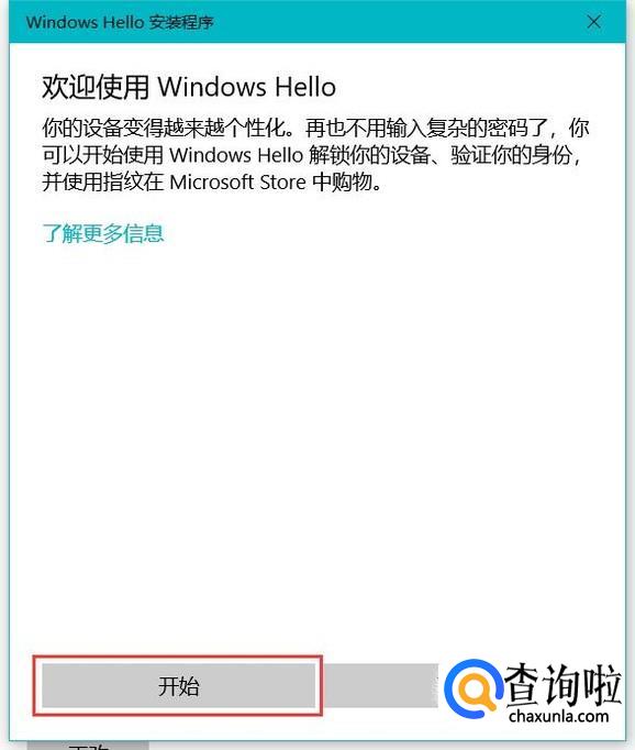 在Windows hello 安装程序对话框中点击开始,然后根据提醒在电脑上触摸传感器上点按即可。