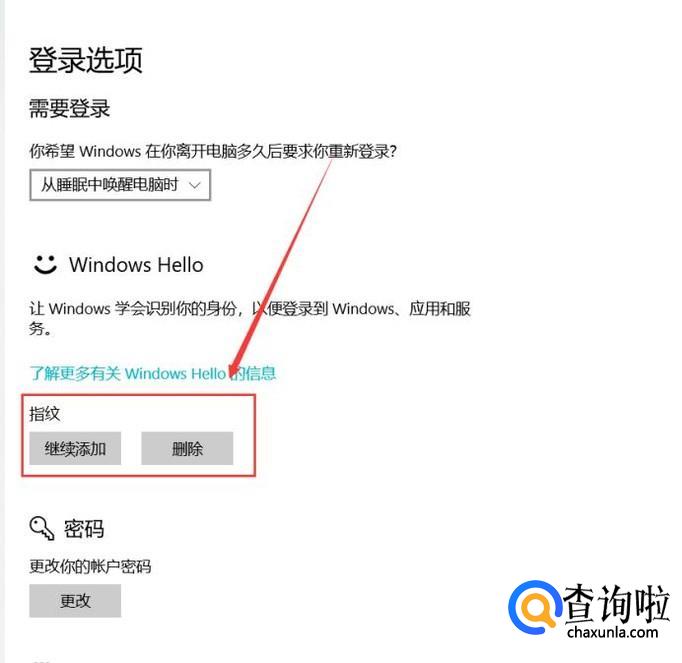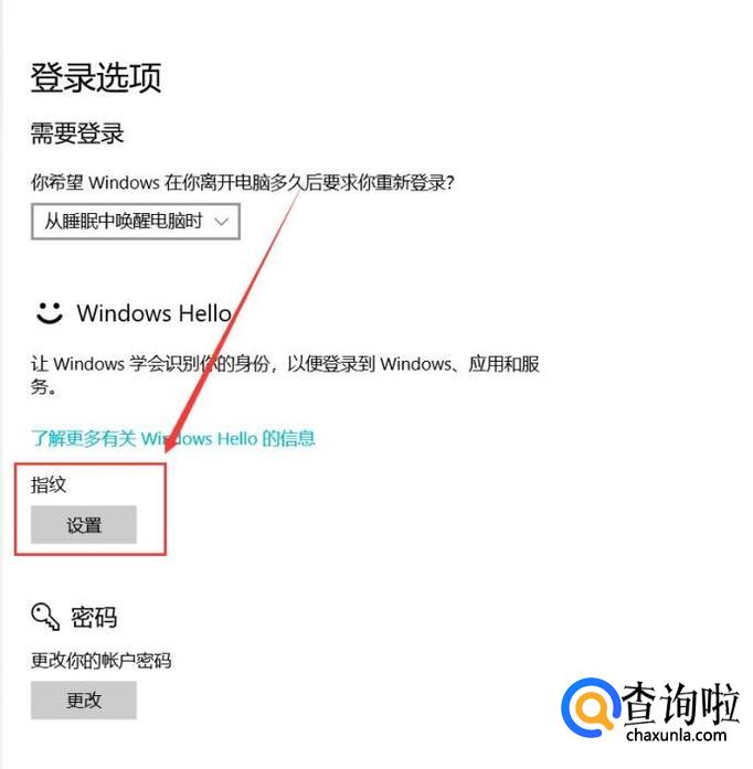 然后在“登录选项”中找到指纹,点击下边的设置按钮。