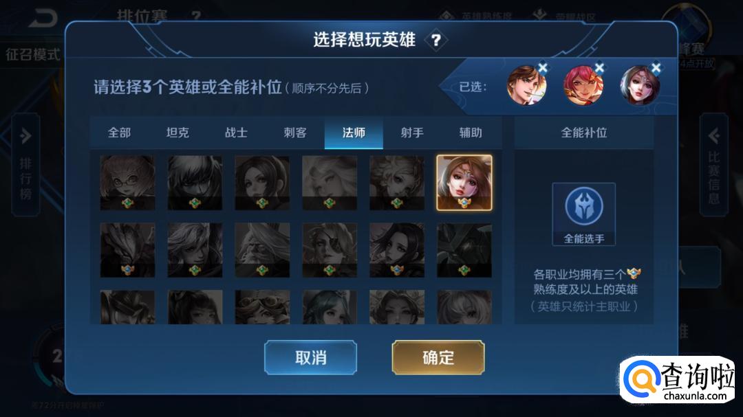 全能达人:各职业均有三个宗师,也就是紫色熟练度及以上的英雄。