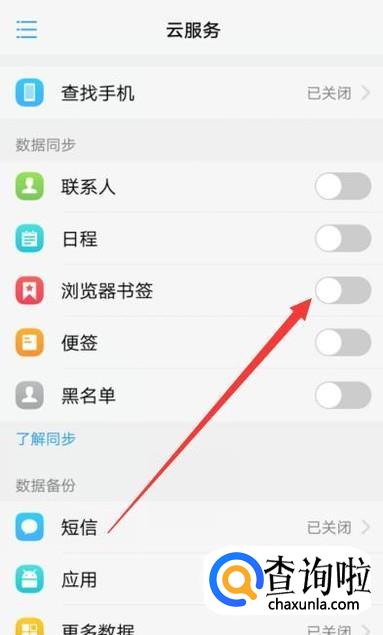 进入之后,打开浏览器书签备份开关,将其进行备份,如图所示。