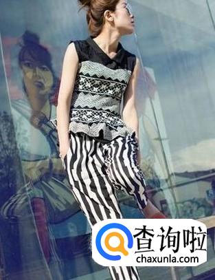 条纹哈伦裤搭配无袖蕾丝花边上衣,既漂亮,又随意,体现出女性活泼、可爱的一面,特别适合身材娇小的女生。