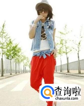 红色哈伦裤搭配白色短T恤和牛仔坎肩,这种穿法颜色跨度大,给人一种潇洒、活力四射的感觉,特别适合性格外向的女生。