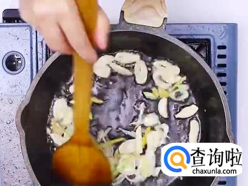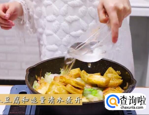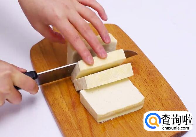 锅中倒油,油热后小火将豆腐煎至两面金黄。