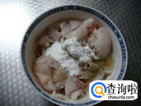 腌制半小时的鱼片现在要开始使用淀粉了,加上淀粉,一边加一边用手抓,直到鱼片变得很独立的样子就好了。