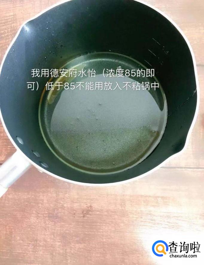 然后往锅中加入适量的水怡,如下图所示。小贴士:小编用的是德安府85浓度的水怡比较合适,因为如果浓度低于85%是不能够放入不粘锅的。