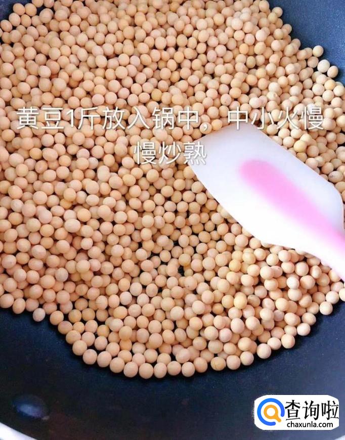 首先锅中放入1斤黄豆,开中小火炒熟,如下图所示。
