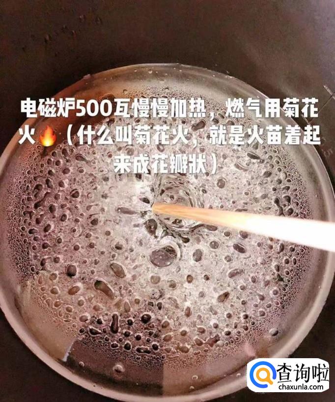 接着电磁炉开500瓦慢慢加热,加热到起大泡就可以关火了,如下图所示。小贴士:如果大家用的是燃气小编建议大家最好使用菊花火,什么是菊花火呢?菊花火就是火苗着起来呈花瓣状。