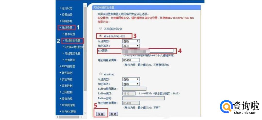 在子菜单中选择“无线安全设置”,点击进入。右边可以选择和设置无线网络的密码类型,以及查看到具体的PSK密码。千万记得,如果修改记得点击保存后,需要重启路由器哦!