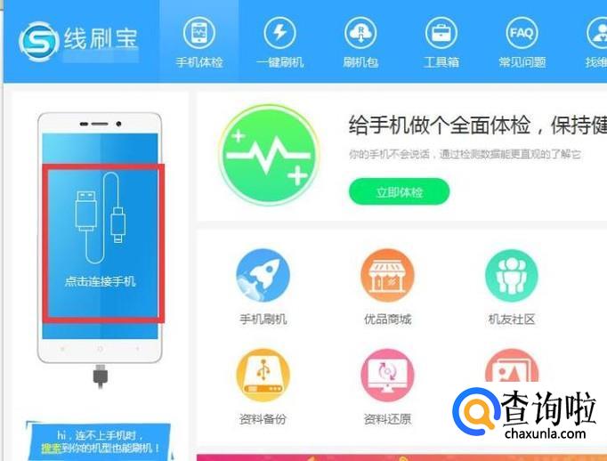 打开线刷宝后,我们需要先将手机连接到电脑,记得手机要打开USB调试模式。