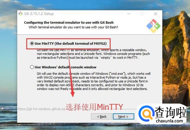 然后是选择命令行模拟器的类型,这里选择MinTTY即可,如下图所示
