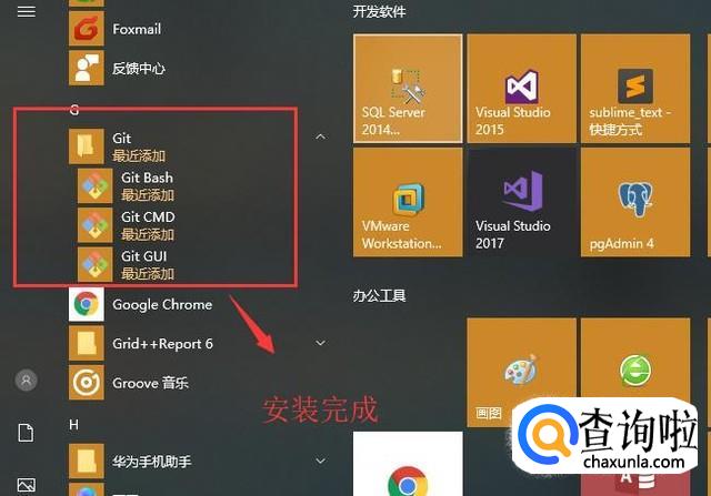最后我们打开开始菜单,如果能显示如下图所示的Git目录则代表Git安装成功了
