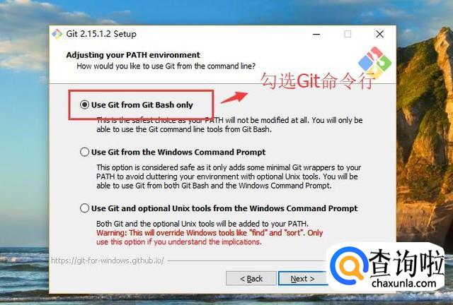 然后会进入配置环境变量的界面,我们勾选第一个选项,使用Git命令行,这样就无需修改Path变量了,如下图所示