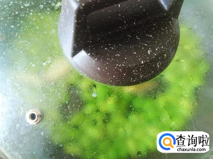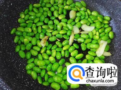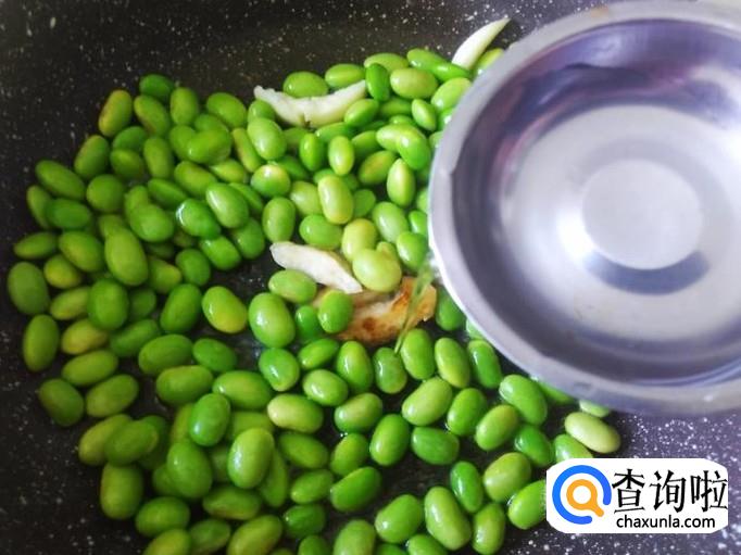 毛豆下锅,加适量的盐翻炒入味,然后下点水花,盖上盖子焗。