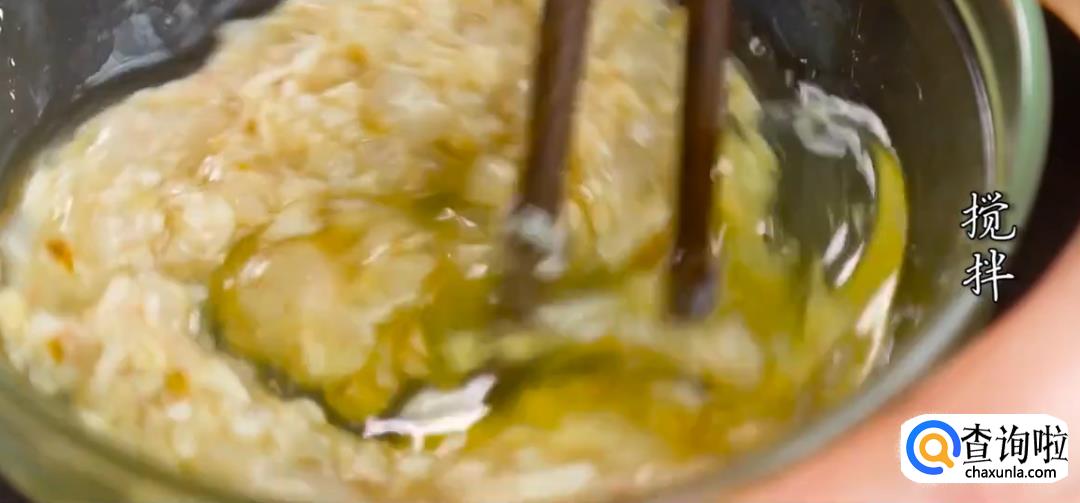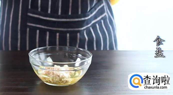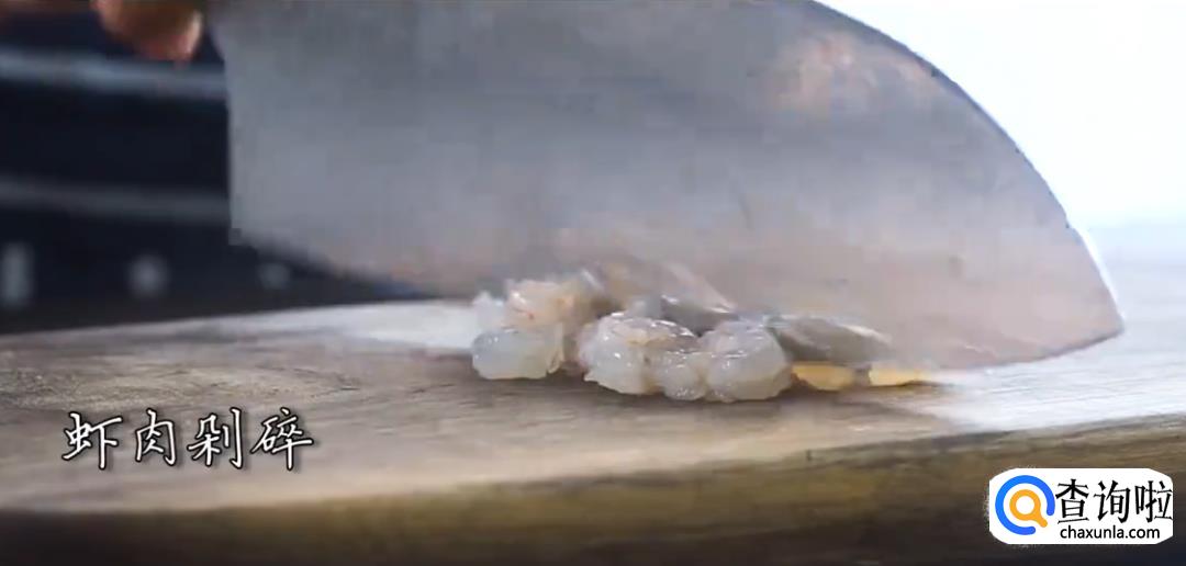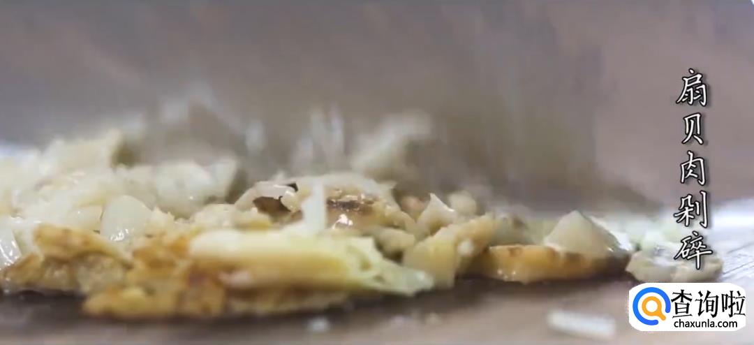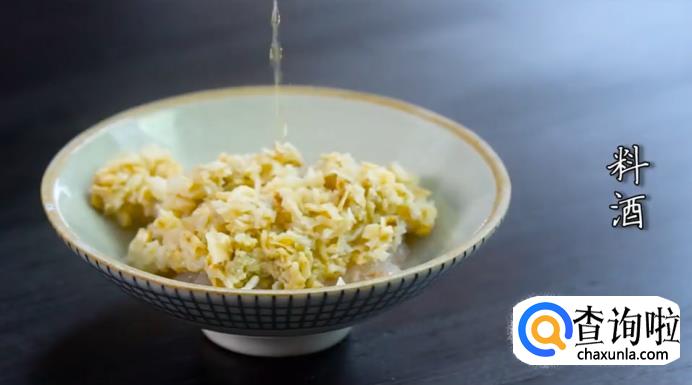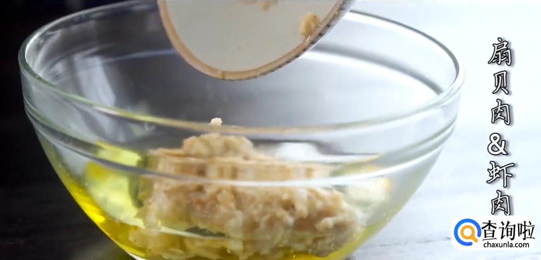 将虾肉、扇贝肉剁碎,加入料酒拌匀腌制一会儿。