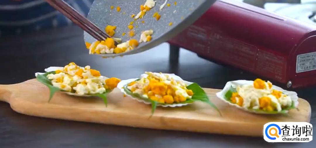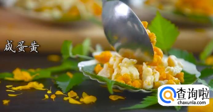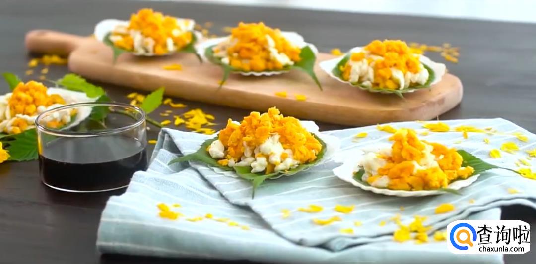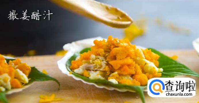 最后,在上面放上适量咸蛋黄碎,撒上适量的姜醋汁(做法:将盐、白糖、姜末、香醋混合拌匀),这样一道美味的赛螃蟹就做好了。
