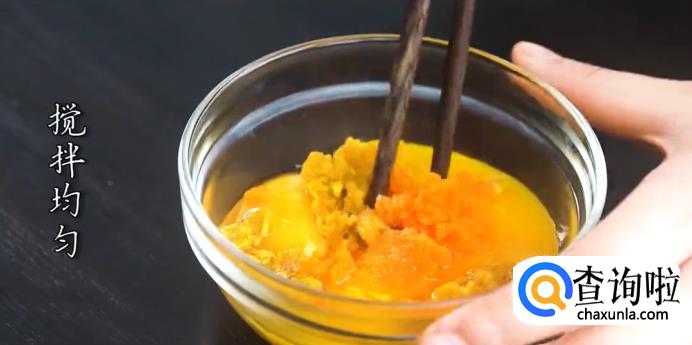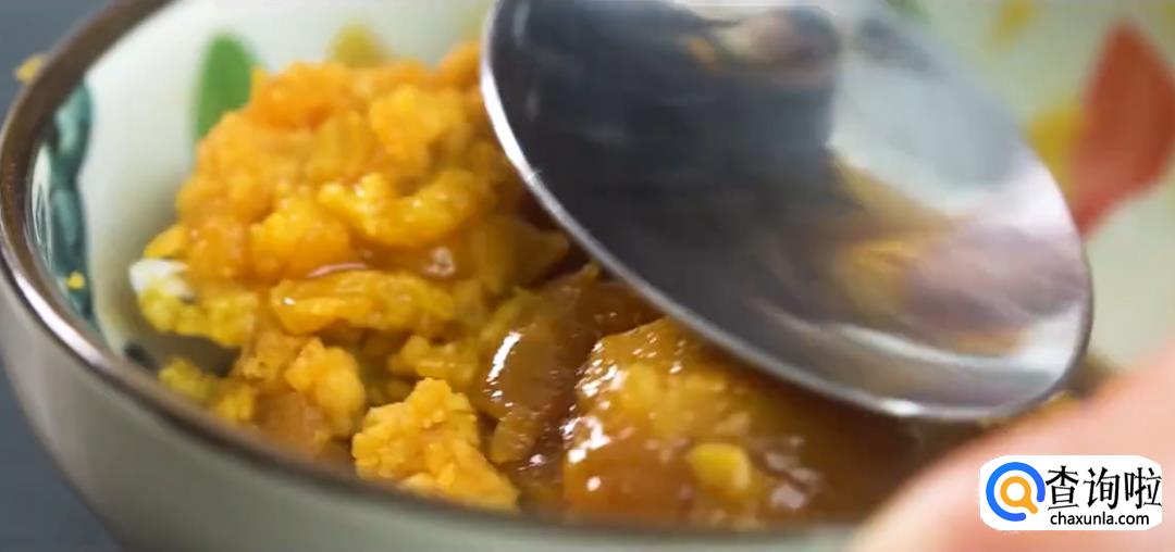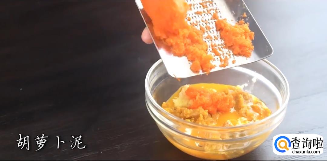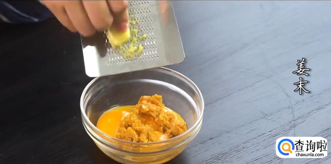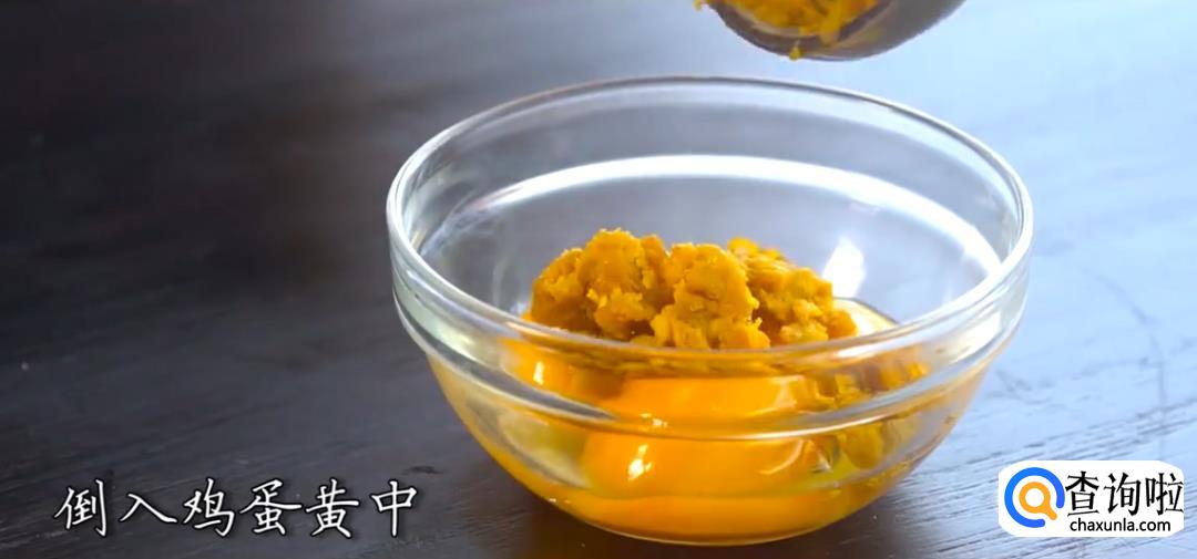 将咸鸭蛋的蛋黄取出,用勺子碾碎后,倒入鸡蛋蛋黄中;加入姜末、胡萝卜泥、盐,搅拌均匀。