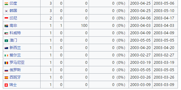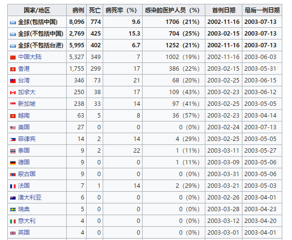 世界卫生组织公布了2002年11月1日至2003年7月31日期间病例汇总: