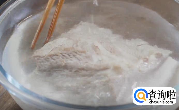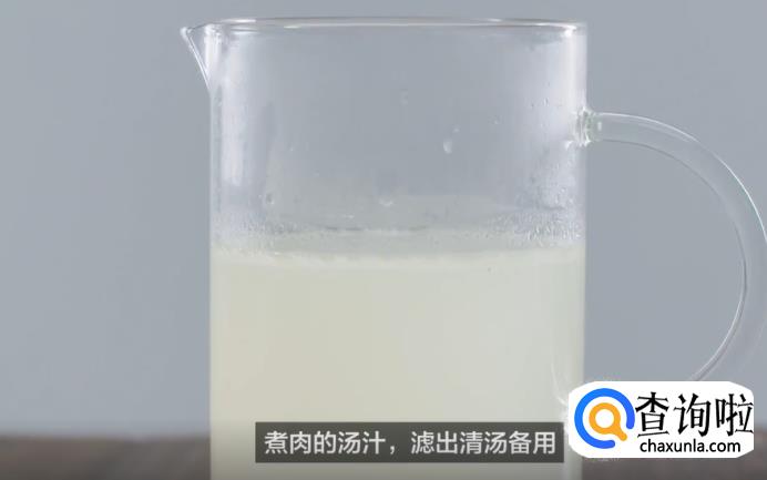 待水煮沸后,加入少许绍酒,再将肉煮至断生,然后捞出来移入温水中洗去杂质。同时,煮出的汤汁不要倒掉,滤出清汤备用。