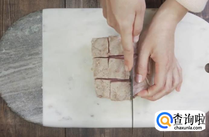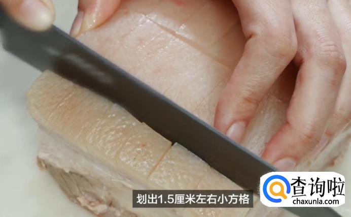 然后,把五花肉放在案板上,肉皮朝上,用刀划出1.5cm左右的小方格,刀口深至第一层瘦肉即可。接下来将肉翻个面,划个井字格。