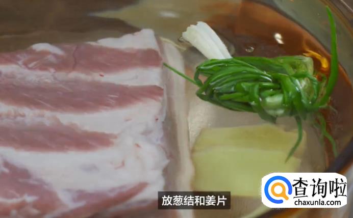 做樱桃肉,肉要选带皮的三层五花肉,先将肉冷水下锅,并在锅中放入葱结和姜片,然后开火。