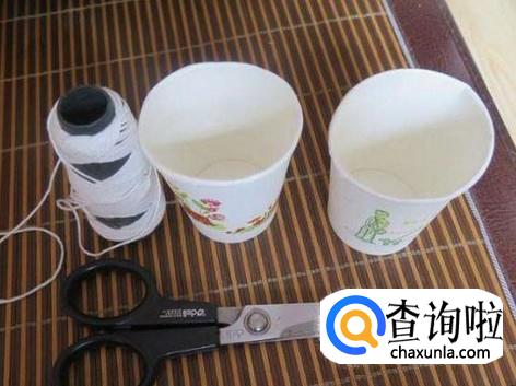 准备两个纸杯,一段线绳和一把剪刀。
