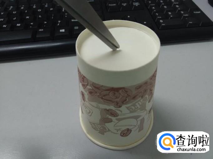 用剪刀在两个纸杯的杯底扎一个比线绳粗些的小孔。