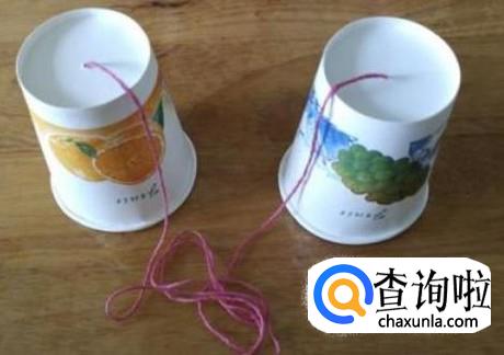 将线绳的两端从两个杯底的小孔中穿进去,在里面打个结,固定好。