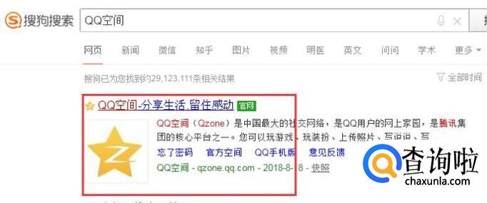 通过检索工具搜索“QQ空间”,在结果中选中官方网站点击进入。