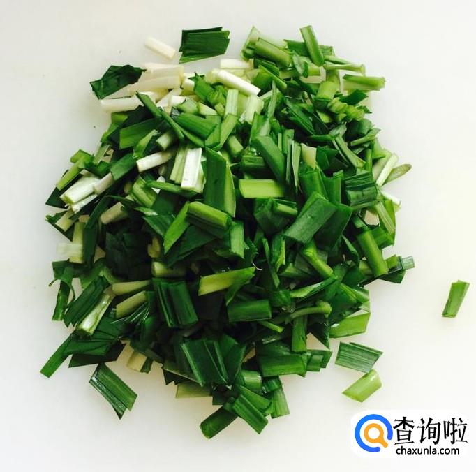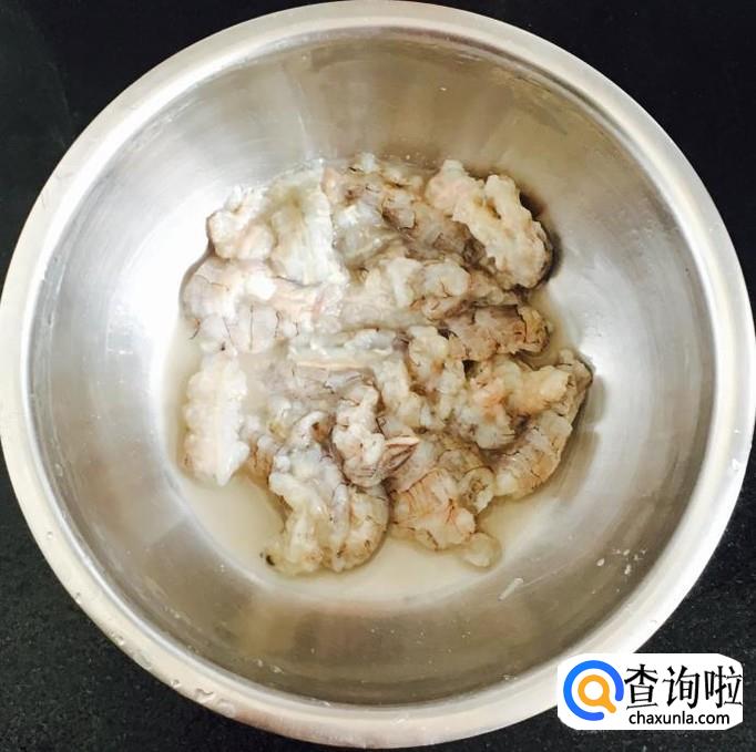 把切好的韭菜段、打三个鸡蛋放入盛皮皮虾肉的容器中