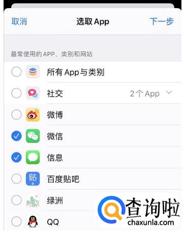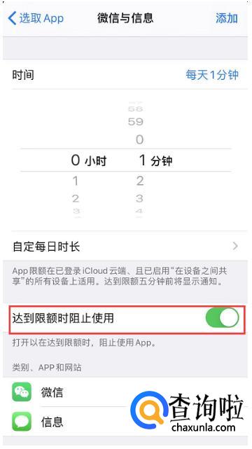 选择完毕之后,点击“下一步”,将时间设置为“1分钟”(最短时间),并打开“达到限额时阻止使用”,然后点击右上角“添加”即可。