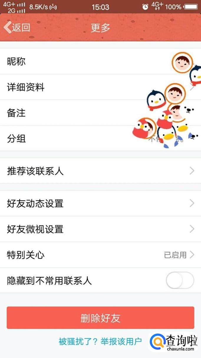 然后,我们在好友列表中找到自己要隐藏动态的好友,点击她,进入到她的资料页面。