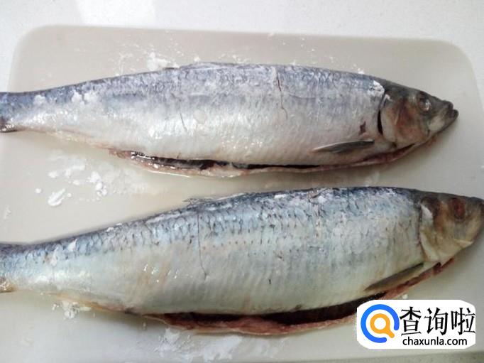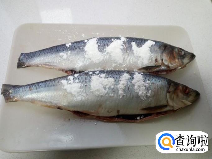 在鱼的两侧撒上少许淀粉,用手涂抹均匀,避免煎塌鱼的时候,鱼粘锅破皮。