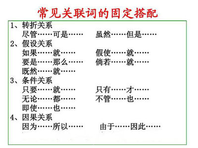 关联词语是一个汉语词语,或一组需搭配使用的汉语词组,是指能在复句中用来连接分句,并表明分句之间关系的连词、副词和短语。关联词一般分转折关系、假设关系、条件关系等。把两个或两个以上在意义上有密切联系的句子组合在一起,叫复句,也叫关联句。复句通常用一些关联词语来连接。大致可分为:并列、递进、转折、承接、因果、条件、选择和假设等八种。